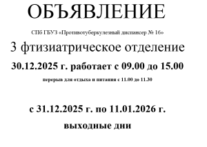 Режим работы 3 фтизиатрического отделения